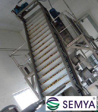 在浮洗機末端,用提升機將原料果輸送到滾杠輸送機,清洗水用泵打回浮洗機繼續循環(huán),同時(shí)將清洗水與原料果分離。