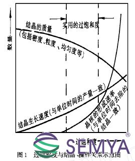 對結晶影響最主要的因素是溶液的過(guò)飽和度,如果溶液沒(méi)有過(guò)飽和度,晶核既不能生成,結晶也不能生長(cháng)。過(guò)飽和度大一些對生產(chǎn)有利,因為推動(dòng)力大,晶核的形成速率和結晶的生長(cháng)速率都大,但也不是越大越好。如果料液過(guò)飽和度太大,晶核形成速率很快上升,使結晶生長(cháng)速率降低,會(huì )出現產(chǎn)品粒度過(guò)細,影響產(chǎn)品質(zhì)量。過(guò)飽和度與結晶、操作關(guān)系示意如圖1 所示