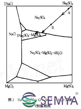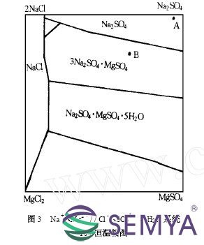 無(wú)水硫酸鈉生產(chǎn)所使用的原料中,除了主要的Na+ 、SO42 -離子外,一般都含有少量的Ca2 + 、Mg2 + 、和Cl -離子,生產(chǎn)時(shí)蒸發(fā)器內壓力、溫度等條件保持不變,隨著(zhù)蒸發(fā)的進(jìn)行,結晶的硫酸鈉不斷取出, 料液中Ca2 + 、Mg2 + 離子濃度相對增大, 體現在Na + 、Mg2 + // Cl -、SO42--H2O 相圖上,如開(kāi)始在A(yíng) 點(diǎn),生產(chǎn)一段時(shí)間后體系移到B 點(diǎn)見(jiàn)圖2, 繼續生產(chǎn),體系逐漸由Na2SO4 的結晶區移到Na2SO4 與復鹽3Na2SO4 ·MgSO4 的共飽線(xiàn)上,此時(shí)無(wú)水鈉鎂礬開(kāi)始析出,在操作溫度不變情況下,體系將沿此共飽線(xiàn)移動(dòng),產(chǎn)品質(zhì)量開(kāi)始下降。如果溫度升高時(shí),Na2SO4 的結晶區逐漸縮小,而3Na2SO4 ·MgSO4 的結晶區逐漸增大, 體系落在了3Na2SO4 ·MgSO4的結晶區,顯然此時(shí)已不是我們所需要的產(chǎn)品了見(jiàn)圖3 。由于無(wú)水鈉鎂礬的結晶顆細小,在粘度較大的硫酸鈉溶液中不易沉降,蒸發(fā)罐內就會(huì )呈現糊狀,使蒸發(fā)無(wú)法正常進(jìn)行,結晶也不會(huì )再繼續長(cháng)大,排出的料液經(jīng)離心機脫水非常困難,濕硝中母液含量較大,氣流干燥也無(wú)法正常運行,產(chǎn)品放置時(shí)間長(cháng)了便結為大塊。為避免上述現象發(fā)生,除對硝液進(jìn)行凈化外,應適當降低排料溫度,即降低蒸發(fā)終溫。從圖2 、圖3 中可以看出,Na2SO4的結晶區隨著(zhù)溫度的降低而增大,這不僅提高了產(chǎn)品產(chǎn)量,而且極大的降低了雜鹽的析出量,大大提高了產(chǎn)品質(zhì)量。那么是不是排料溫度越低越好呢? 也不是,圖4 是Na2SO4 -H2O 系統相圖,從圖中可以看出,硫酸鈉溶解度在32138 ℃最大,低于此溫度時(shí),系統不再結晶Na2 SO4 , 而是結晶出Na2 SO4 ·10H2O 。當料液溫度接近32138 ℃時(shí), 由于硫酸鈉溶解度增大,產(chǎn)量將受到影在水中響, 這對生產(chǎn)是不利的。